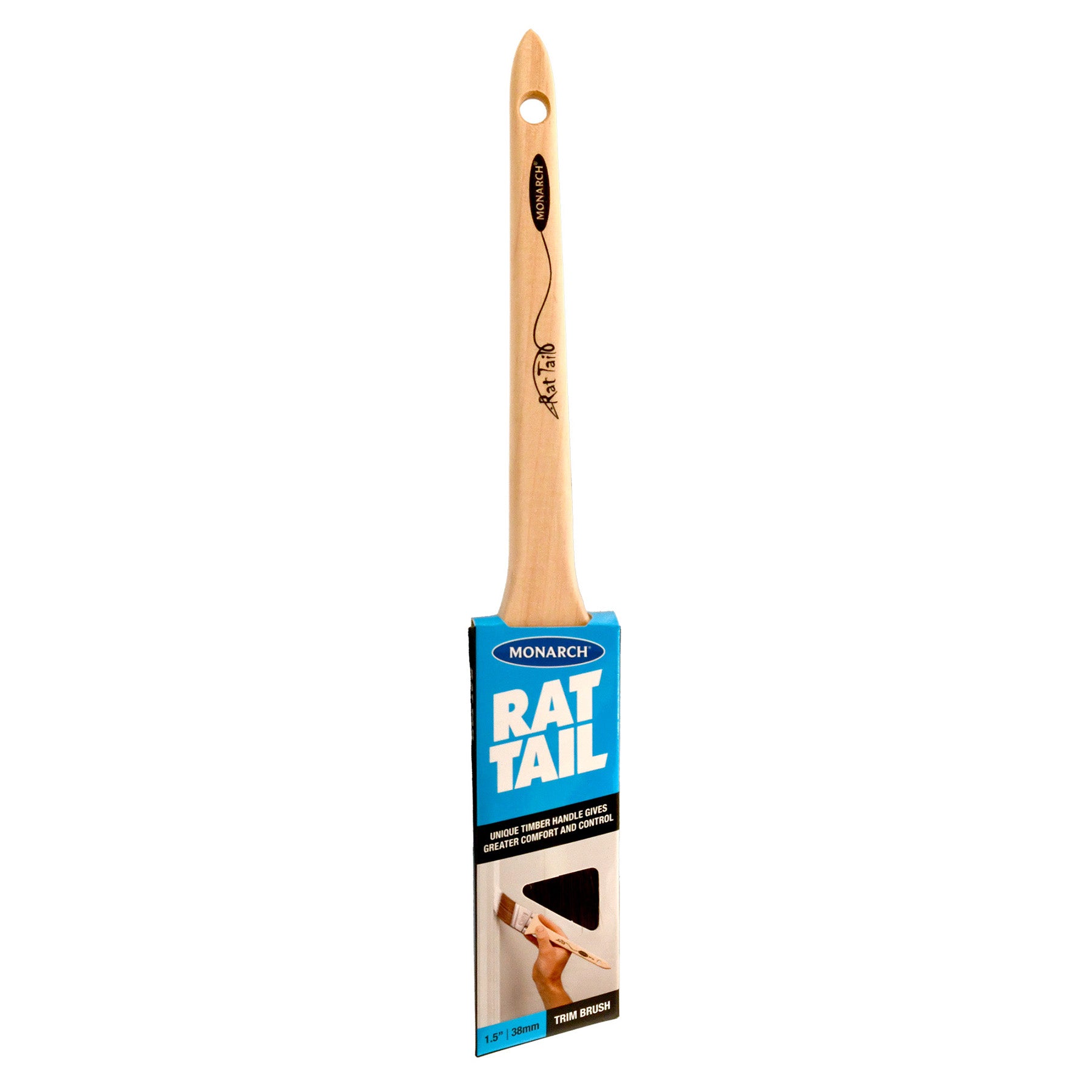 MONARCH Rattail Angle Cutters feature a longer, thinner raw timber handle for more flexibility. It has slimline stainless steel ferrule for improved durability, the angled synthetic solid tapered filament in combination with the slimline ferrule carries less paint which allows for more control.